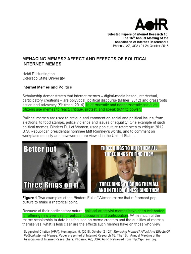 This study responds to calls for research into effects of internet memes. This research paper thus analysis how internet memes have been used to communicate political satire. The internet research agency is based in st. Internet memes as we know them today are units of popular culture that are circulated imitated and transformed by users. In the field of computer vision and multimedia information retrieval internet memes have attracted the attention of the research community 8 18 19 20 21 22 23 24 25 26 27. The internet research agency and advertisements on february 16 2018 special counsel robert s. Internet memes have become a tool for citizens seeking to participate actively and discursively in a digital public sphere.