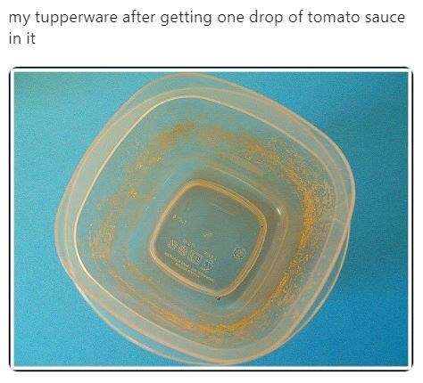 One day your brand new tupperware is crystal clear and squeaky clean and then you fill it with literally anything red and it s suddenly orange tinted for life. Tupperware after tomato sauce refers to the stubborn stain tomato sauce leaves behind after being stored in tupperware. This truism has been commented on since tupperware was invented but since then axiom spread online the stain has been compared to other orange or red colored people or things beginning in 2018. Rubbing alcohol has been very effective removing a number of stains caused by food dyes. This dank meme is so universally understood because if you ve ever eaten leftover spaghetti out of tupperware then you have with 100 certainty experienced this irritating phenomenon. Thanks for visiting and come back soon. The tupperware after tomato sauce meme is something anyone can relate to this dank meme is so universally understood because if you ve ever eaten leftover spaghetti out of tupperware then you have with 100 certainty experienced this irritating phenomenon.